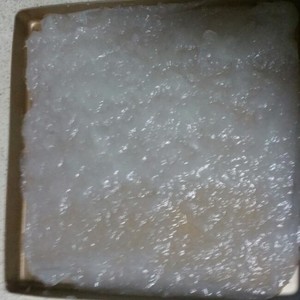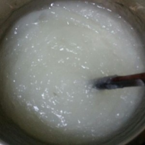 2、剩下的500g水燒開后轉小火,把第一步的混合液體緩慢倒入,邊倒邊快速攪拌,直到鍋中的液體相對固化并成透明狀。